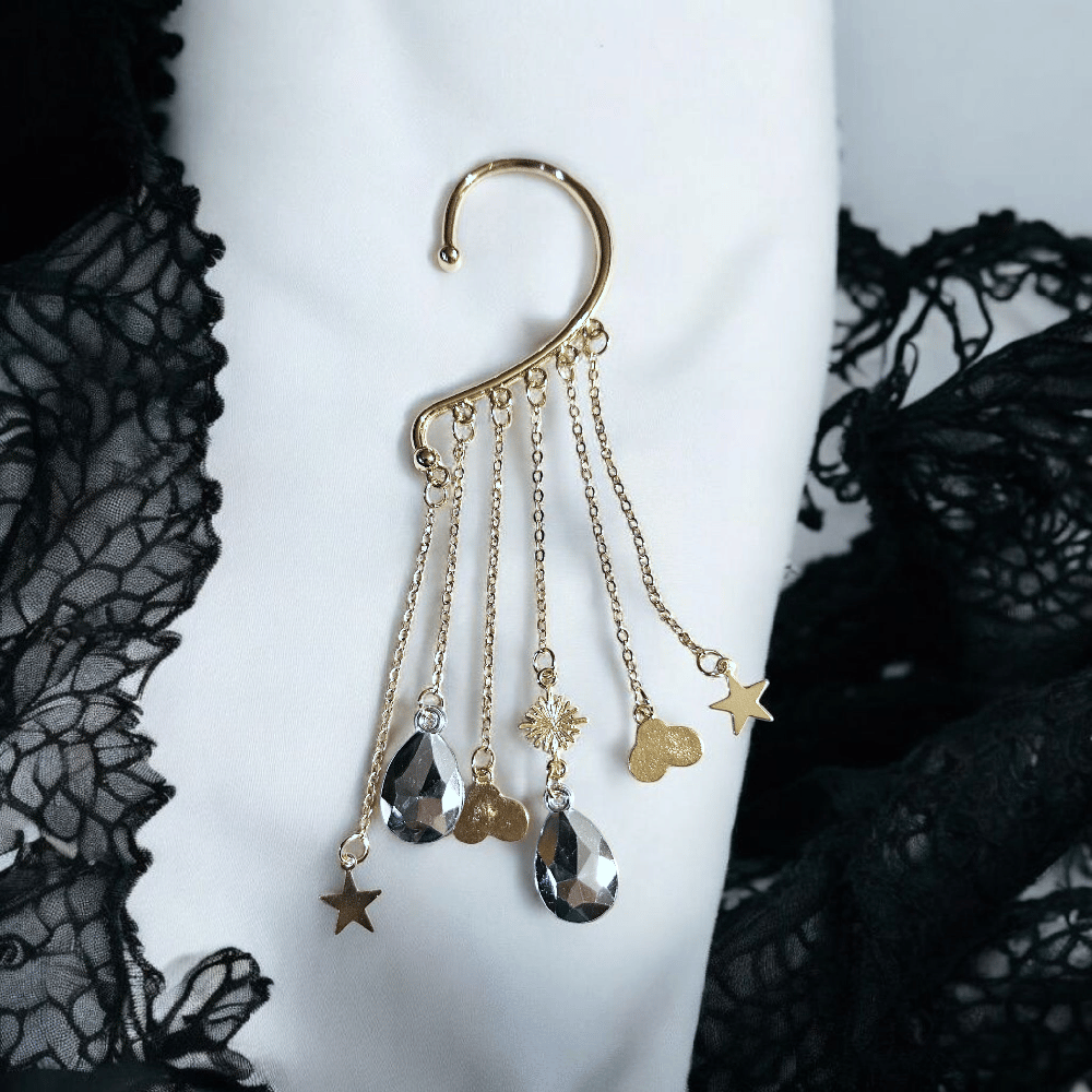 These beaded ear cuffs are handmade custom created. Ear cuffs are gold or silver with lots of pretty dangles. Cuffs slip over the back of ear, no piercing required for these. They look great with all updos. You will receive one cuff. Dangles on cuff are approx 3" long.