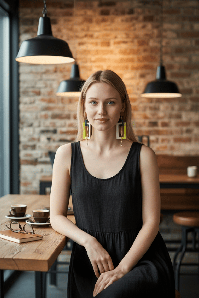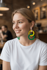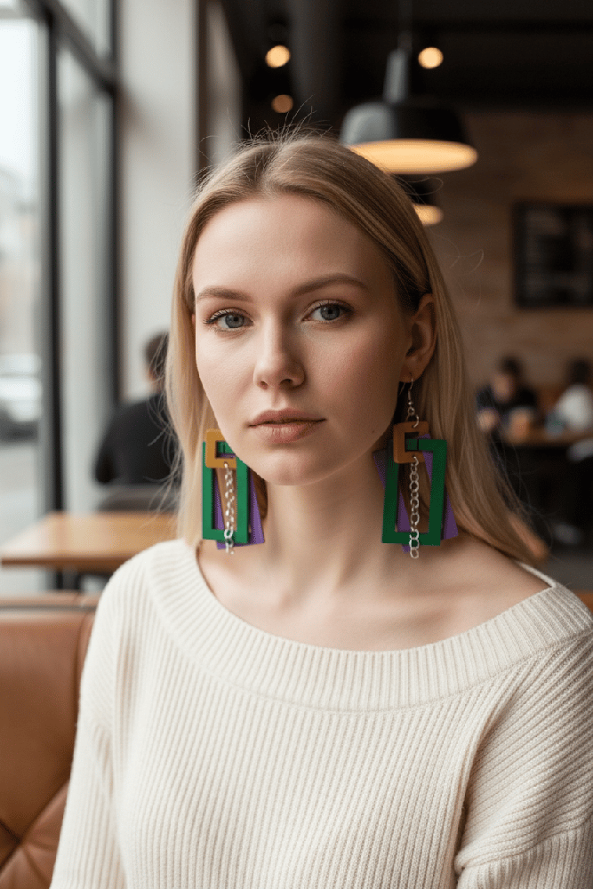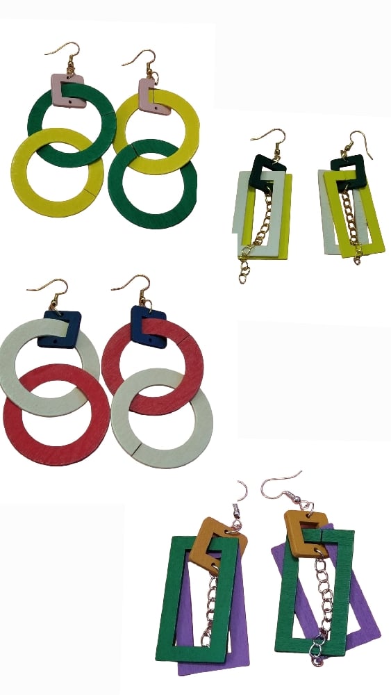 These modern geometric dangle earrings feature a stylish mix of circles and rectangles in beautifully complementary colors. Measuring approximately 2" long, they add the perfect pop of color and movement without feeling heavy. Crafted from balsa wood, they are incredibly lightweight for comfortable all-day wear. Their bold yet minimalist design makes them easy to dress up or down—perfect for everyday outfits, creative workwear, or adding a statement touch to special occasions.